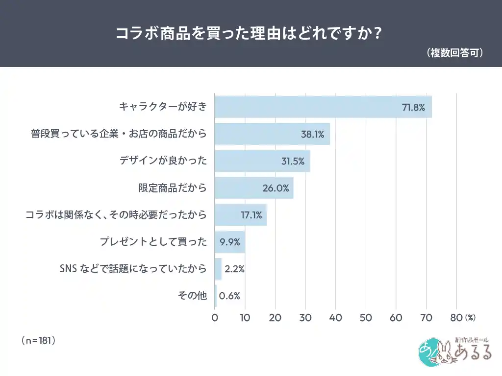 この結果から、キャラクターへの関心だけでなく、商品自体の魅力や価格、デザインといった要素が購買判断に影響している可能性が考えられます。 |