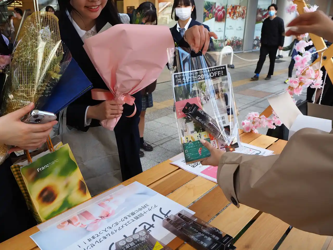 会場には、巨大な卒業証書を背景にしたフォトスポットやチェキ撮影コーナーが用意され、多くの皆さまにお楽しみいただきました。来場者の方々は友人やご家族と記念撮影を行い、卒業という節目を形に残すひとときを過ごされました。 さらに、地域の皆さまから卒業生へのエールを書き込む「桜メッセージボード」や「1年後の自分へ手紙を書く」企画も実施され、世代を超えた交流と未来への意識を育む場となりました。 当社協賛品も、こうした思い出とともに、新生活で“自分らしく人と向き合う”準備を支える一助となればと願っております。 |