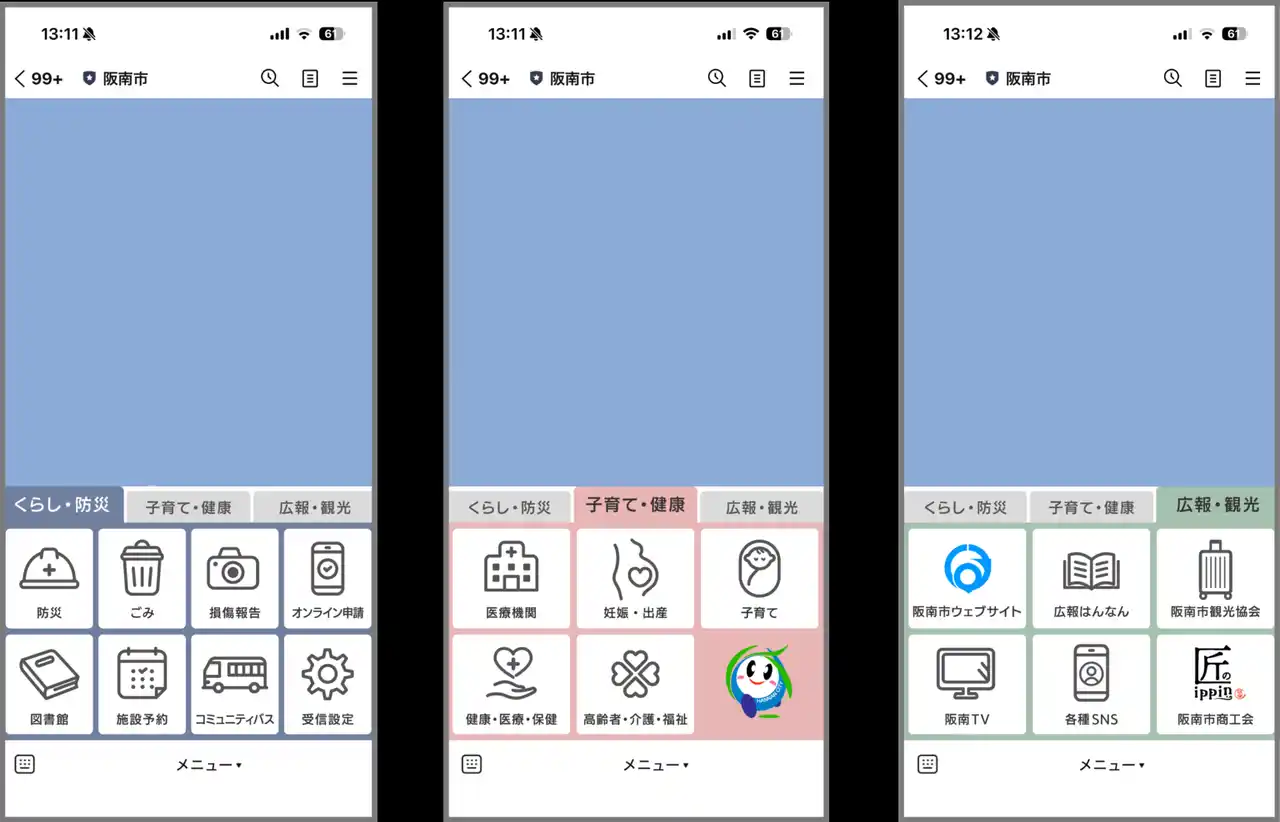 | 阪南市LINE公式アカウントのリニューアルにあたり、プレイネクストラボが提供する「スマート公共ラボ for GovTechプログラム」が採用されました。今回のリニューアルでは「くらし・防災」「子育て・健康」「広報・観光」などの情報カテゴリーについてのチャットボット機能を実装。また情報発信がさらに効果的にできるように「セグメント配信機能」を導入。様々な市政情報を届けることが可能となりました。 | |||||||||||||||||||||||||||