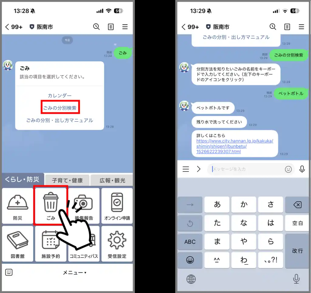 | 「ごみ」では、「ごみの一問一答機能」を搭載しております。LINEのトーク画面に直接「ペットボトル」「食品トレイ」などの破棄したいごみの具体名を入力することで、分別方法や捨てる際のコツを自動返答します。 | |||||||||||||||||||||||||||