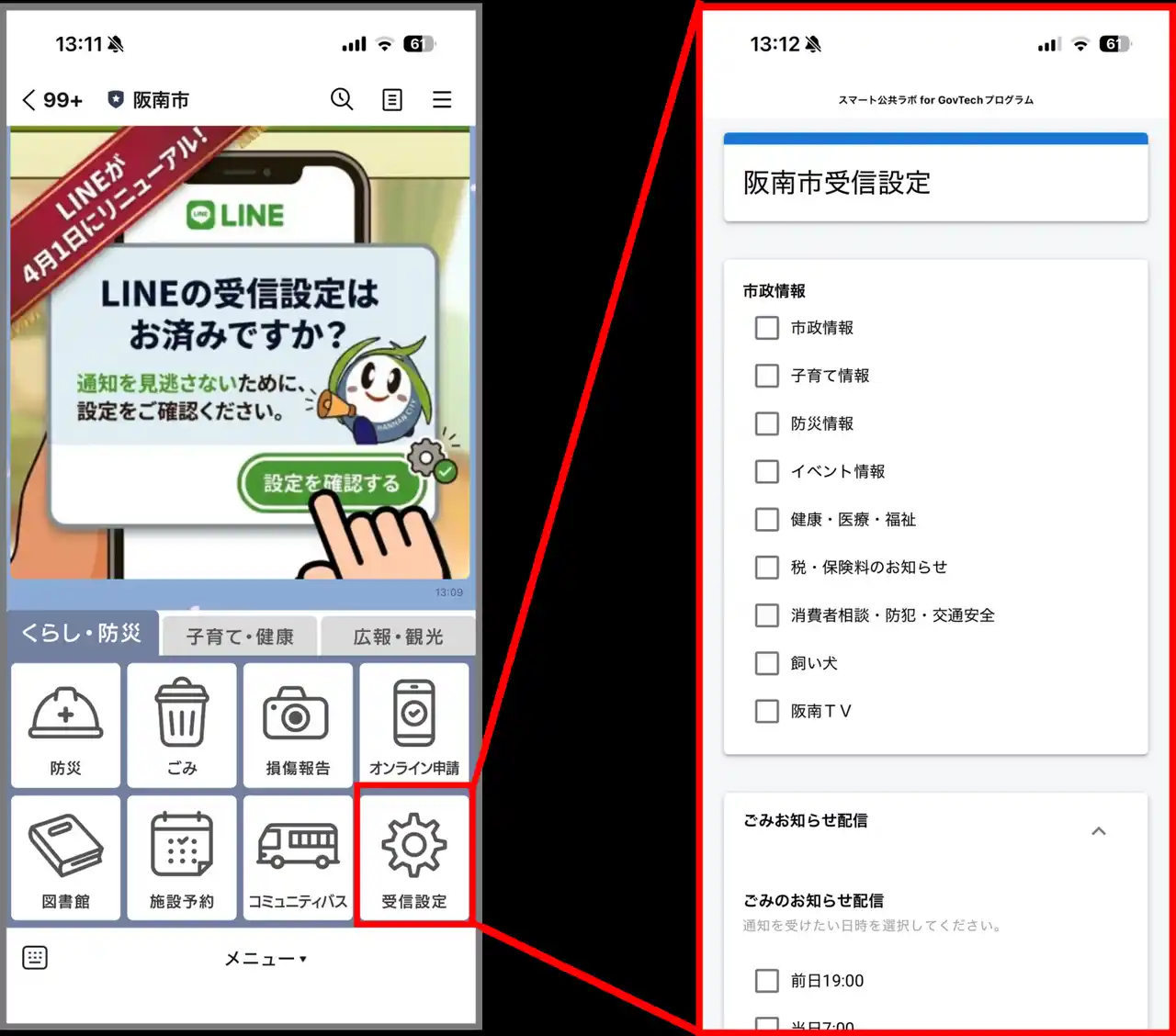 | これまではLINEに登録している全ての住民に送られていた配信ですが、リニューアル以降は欲しい配信カテゴリーを「受信設定」に回答することでカスタマイズすることができます。住民がほしい情報に絞って配信ができるため、市からの情報発信がこれまで以上に効果的になることが期待されます。 | |||||||||||||||||||||||||||
