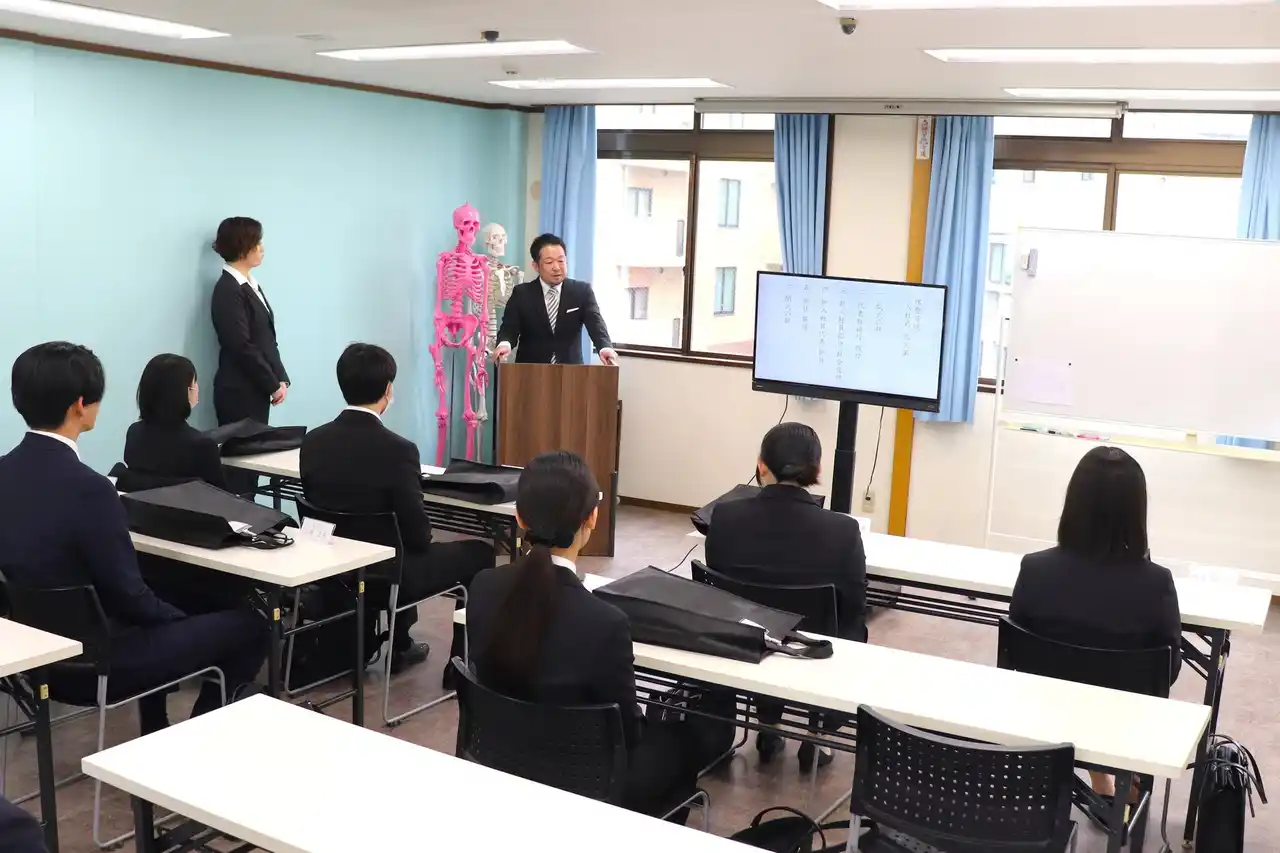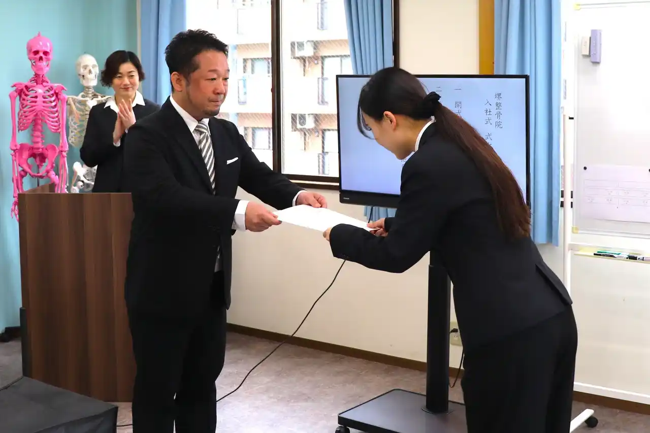 新入社員代表者による挨拶では、堺整骨院グループの一員として地域医療に貢献したいという熱い決意と、未来に向けた力強い抱負が述べられました。 |