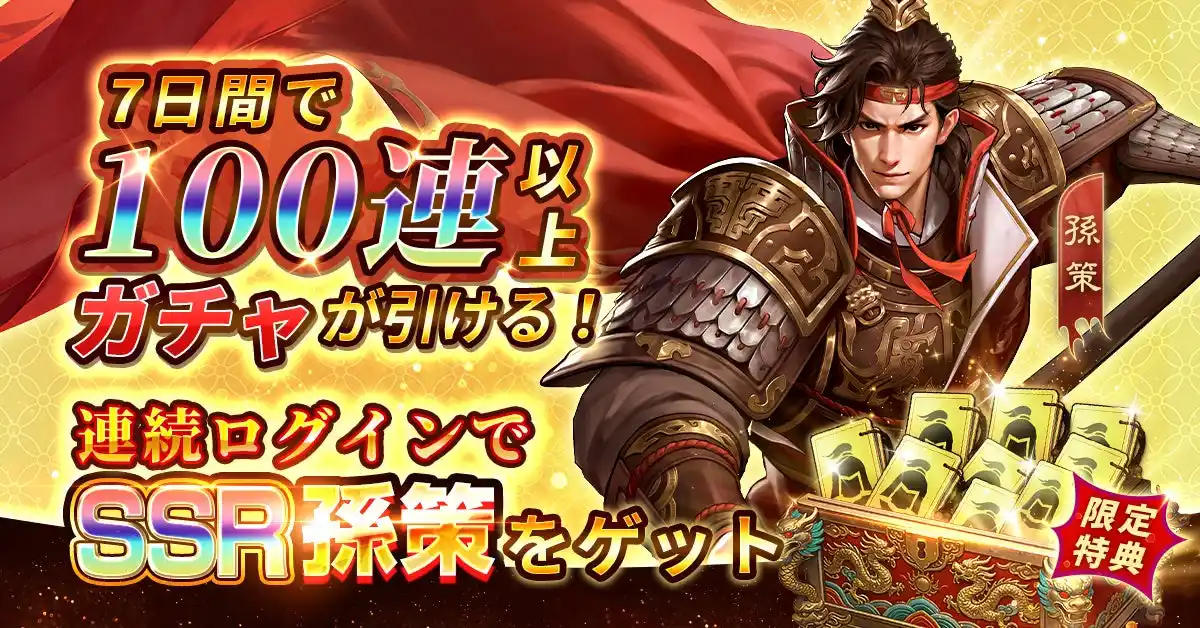 今すぐゲームをダウンロードしていただくと、事前登録特典として「最大30連分のガチャチケット」が獲得可能です。さらに、連続ログインボーナスとして、強力なSSR武将「孫策」を無料でプレゼント! |