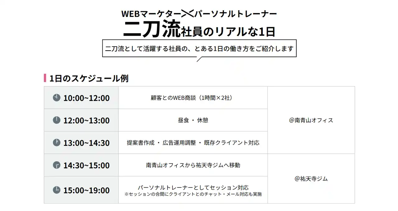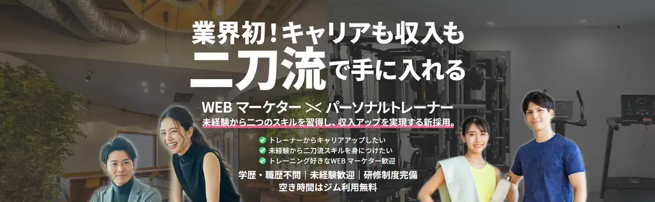 二刀流採用は、Webマーケターとパーソナルトレーナーの2つの仕事を同時に行うキャリアモデルです。 |