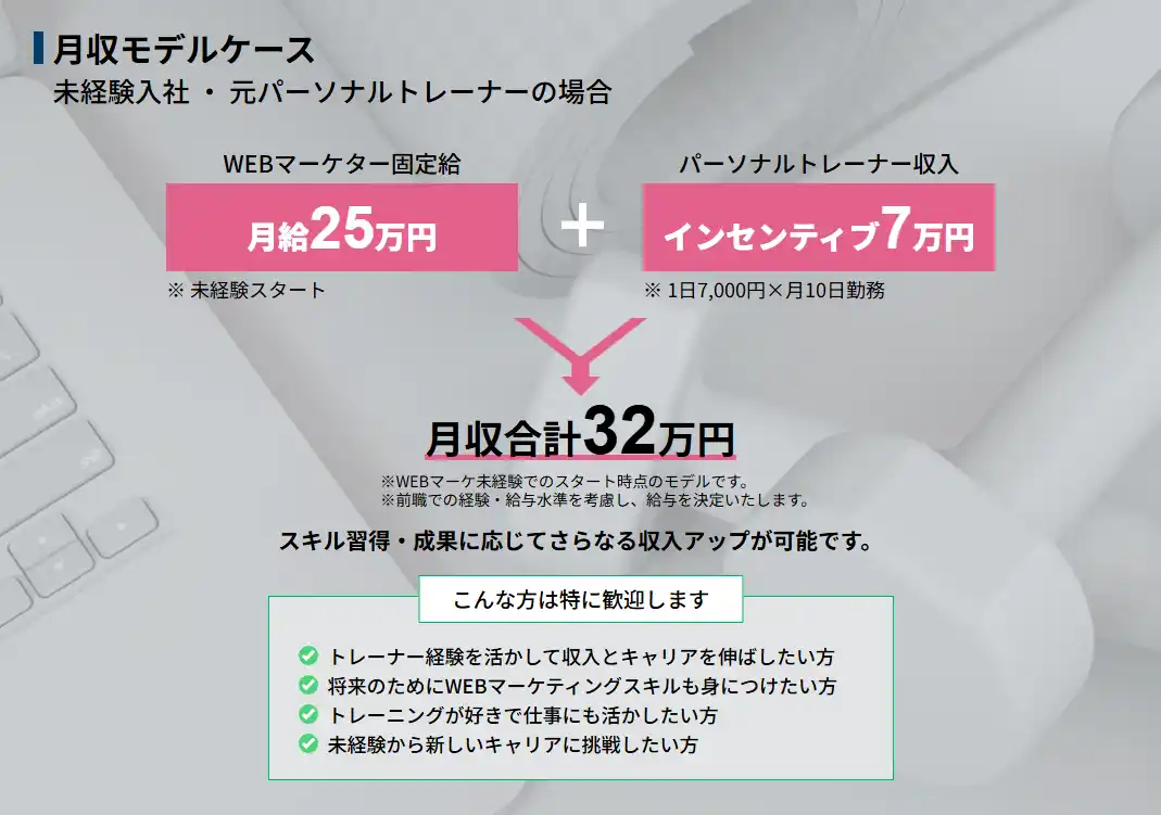 本制度は、キャリア形成(Webマーケター)と収入確保(パーソナルトレーナー)を同時に実現する新しい採用モデルです。 |
