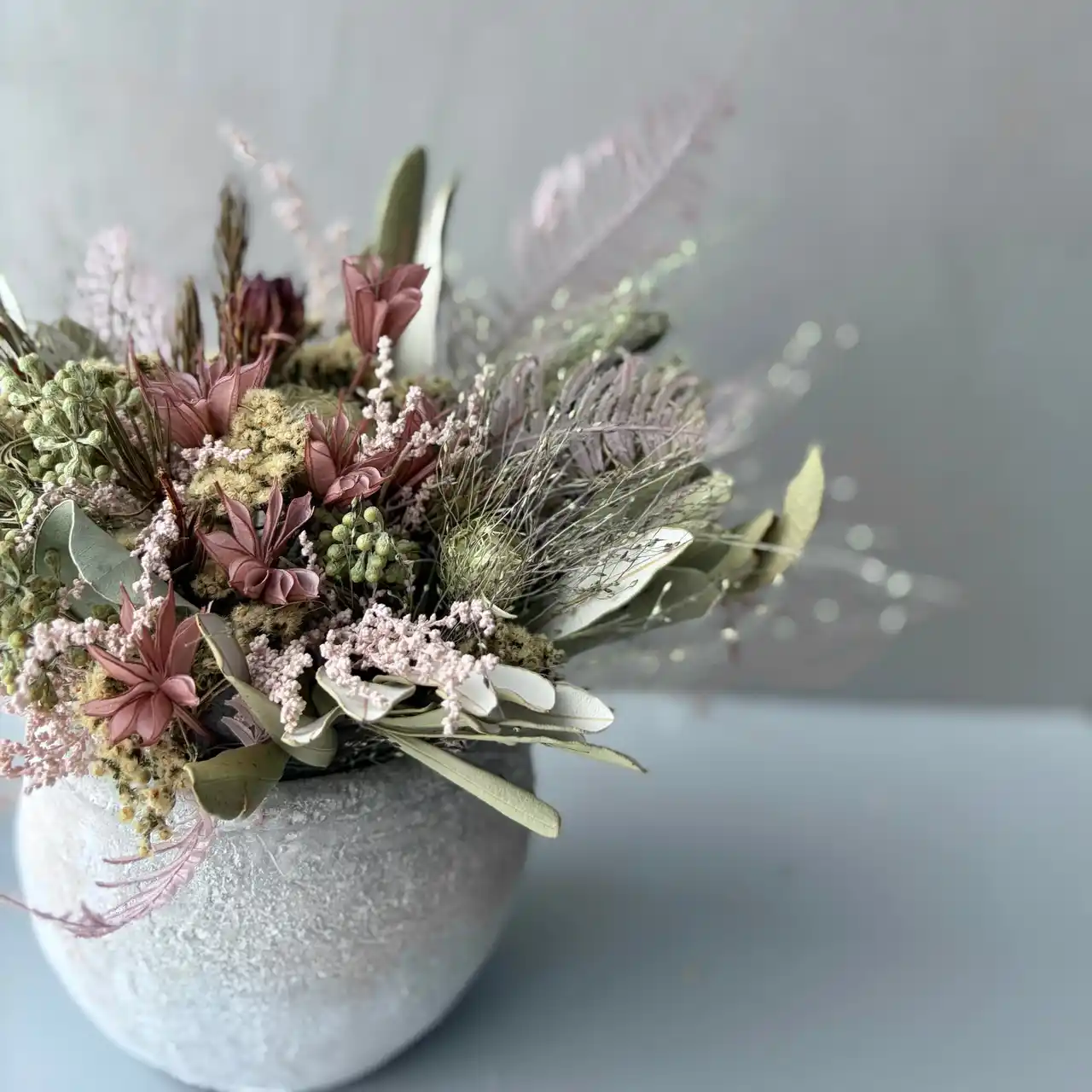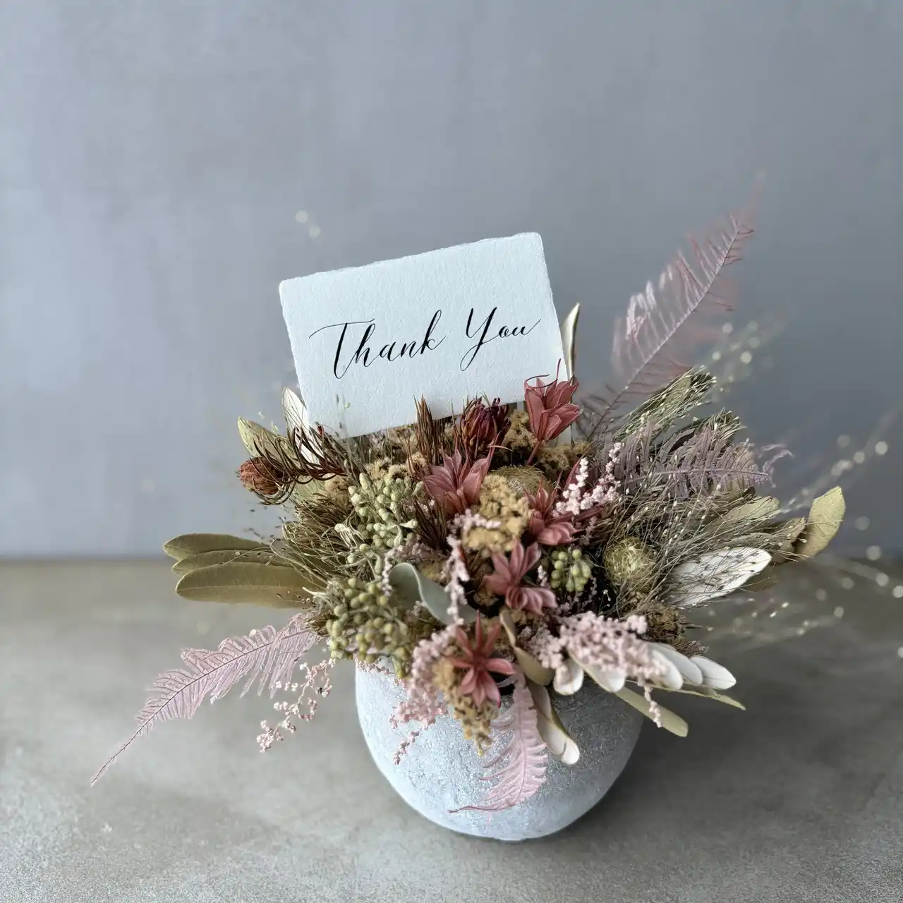 ドライフラワーならではのアンティークなピンクの色合いは、可愛くなりすぎず、優しい華やかさを演出します。 |