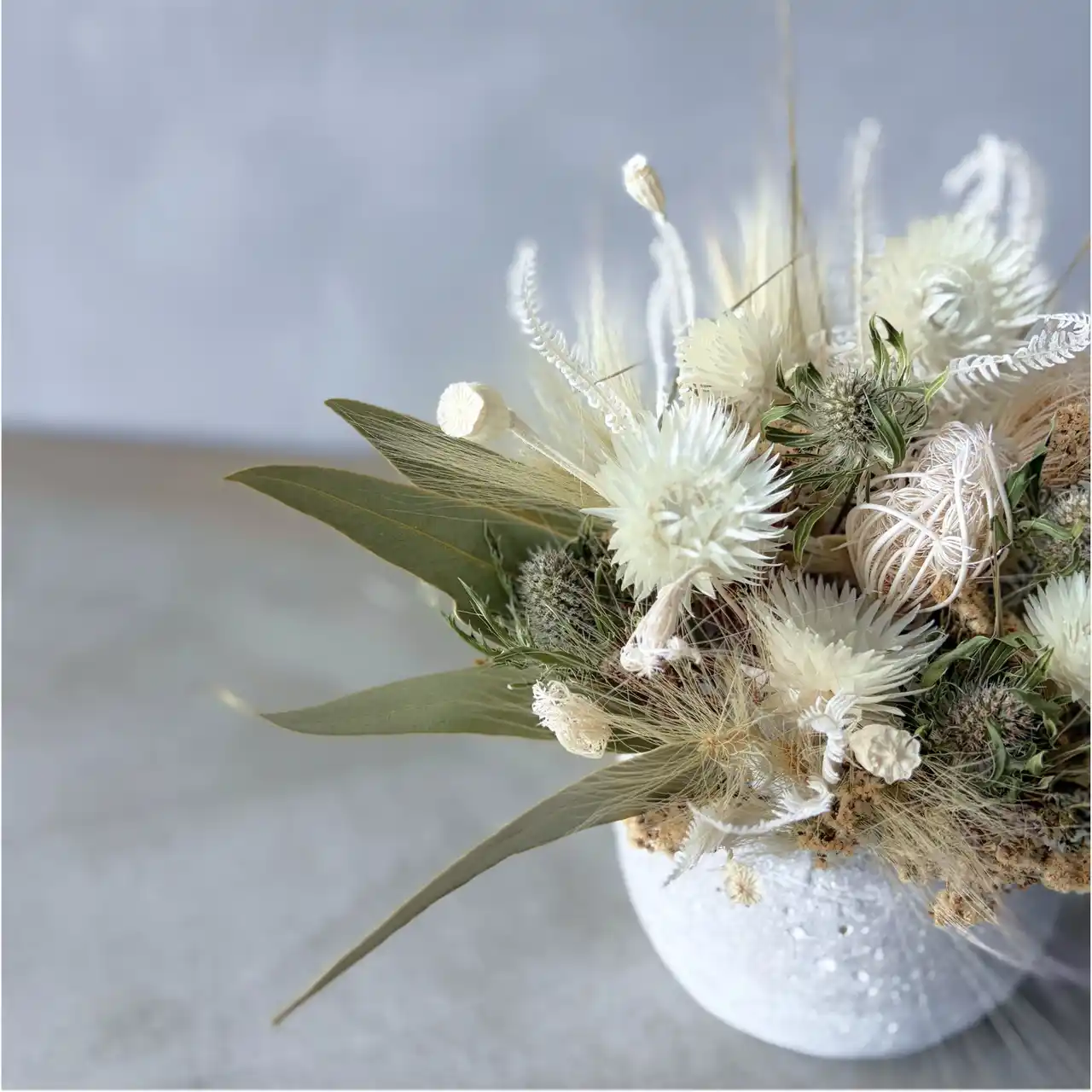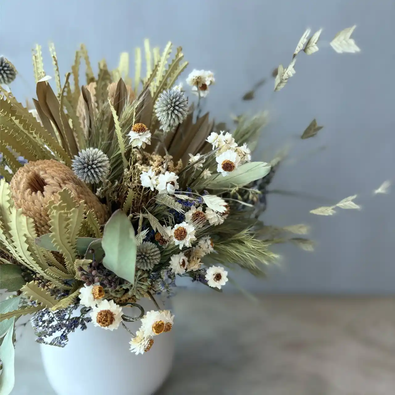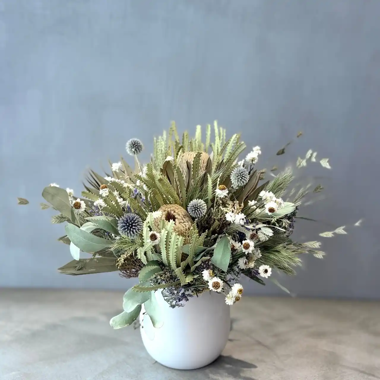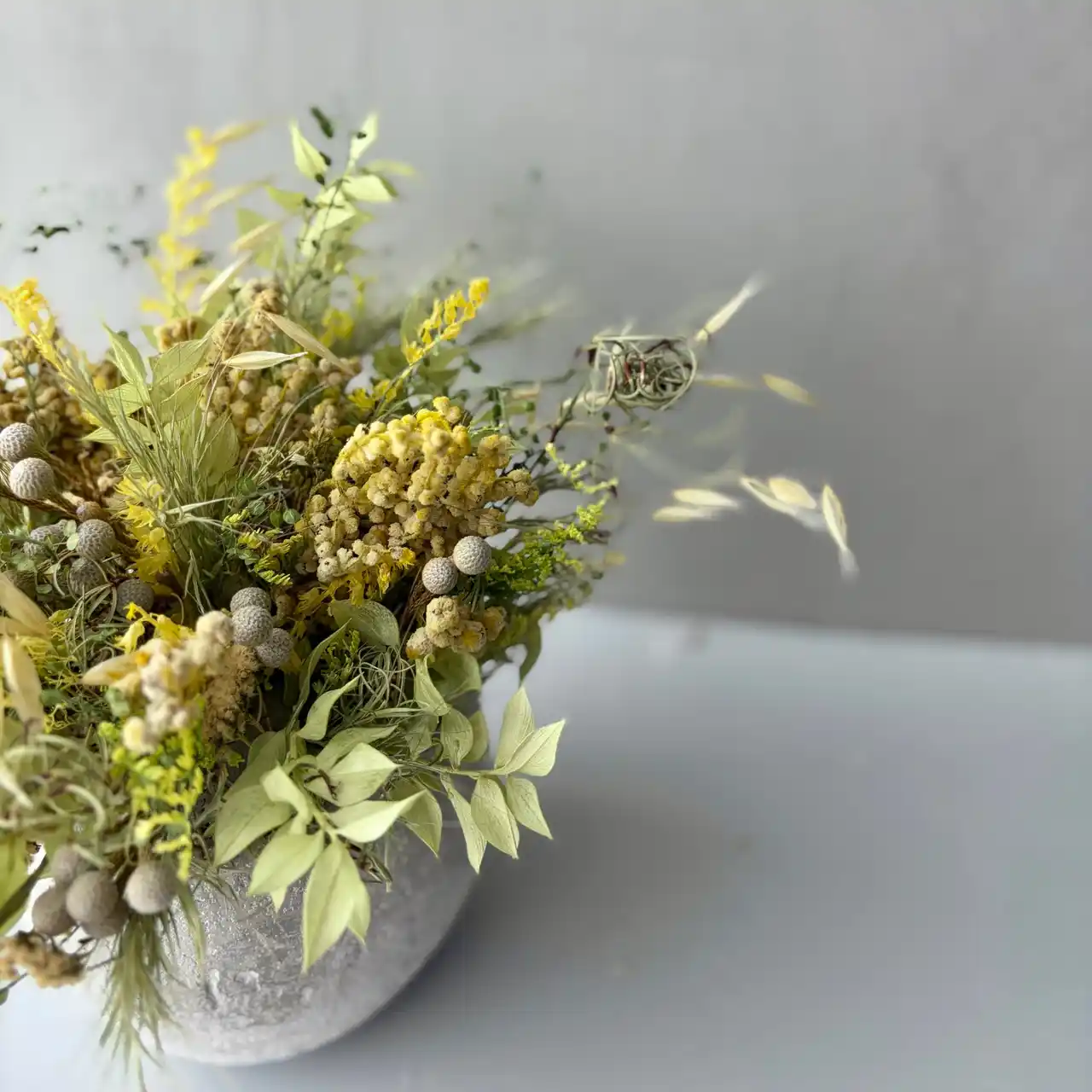 バンクシアや瑠璃玉アザミ、パームフラワーなど個性豊かな花々をワイルドオーツやアンモビューム等のやさしい草花でまとめました。お部屋のアクセントとして、空間を彩ります。 |
