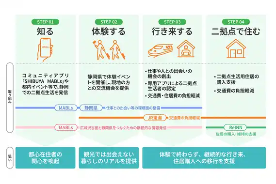 2026年度からは、アプリを起点としたサービスである「MABLs(マブルス)」が、二拠点生活に関する広域渋谷圏での情報発信と、静岡県内での仕事や人との出会いを組み合わせたモデルを新たに構築し、アプリ上で利用可能とすることで二拠点生活を更に推進していきます。 |