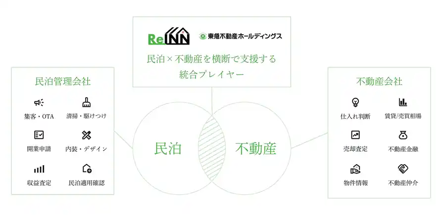 ReINNは、民泊の開業から運営、売買までを横断的に支援する包括プラットフォームを提供しています。民泊物件の購入のご相談から、民泊専用ローンのご案内、民泊の管理・運営を代行する住宅宿泊管理業者のご紹介など、民泊事業に必要な機能をワンストップでつなぐことで、オーナー様の意思決定を支援しています。2026年3月現在、民泊の管理・運営を担う住宅宿泊管理業者や、民泊物件の取扱いに強みを持つ不動産会社など累計40社以上と連携しています。物件・資金・運営の各領域をまたいで最適な支援先を提案できることがReINNの強みです。 |