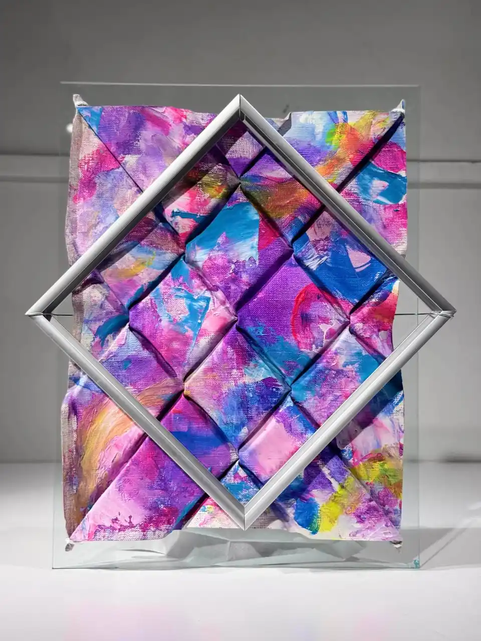 現代アーティストSHEERの抽象画を、折り紙アーティストのHiro Kanoが「折る」ことで完成させるアートユニット。0と1のデジタル世界にはない、肉体的な「手触り」や計算不可能な「偶発性」を追求。時の流れの中で重なり合う人間の複雑な想いを、色彩と折り目の層に閉じ込める。 |