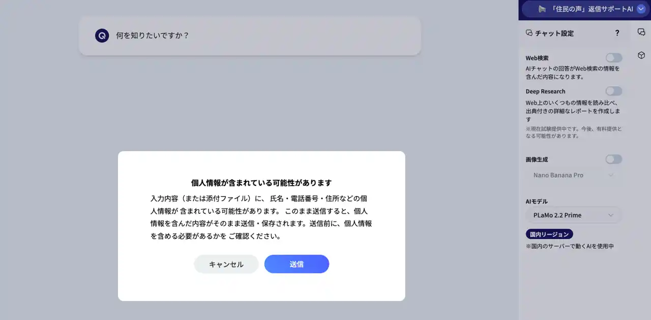4. 個人情報の自動検知・禁止ワードブロック・検知ログの3層防御を搭載 ― 「使わせたいが、漏らさせない」情報ガバナンスをAIの力で実現