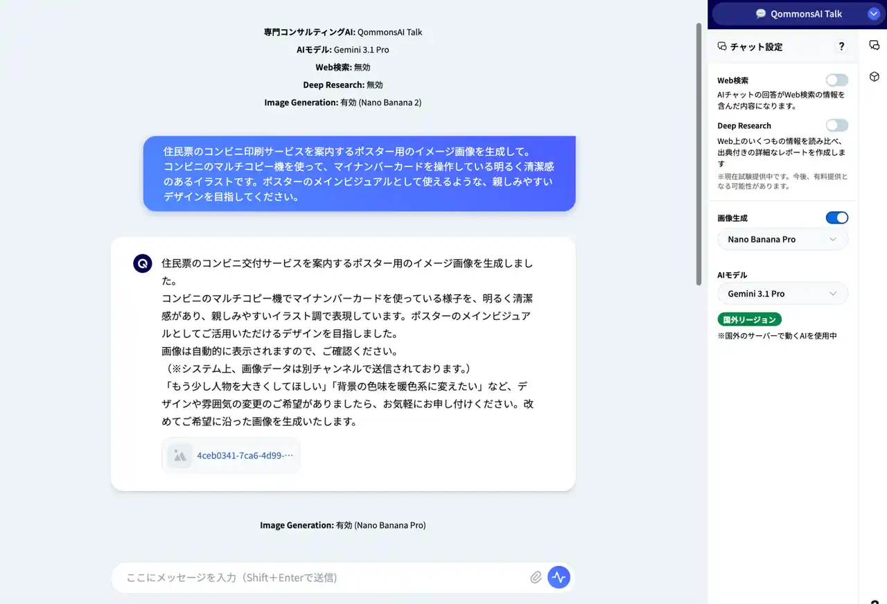 「Nano Banana 2」「Nano Banana Pro」「GPT Image 1.5」の3モデルを搭載しました。Nano Banana 2は4K解像度・多言語テキスト描画・SynthID電子透かし自動付与に対応。広報ポスターやチラシの素案を、AIが数秒で生成します。デザイン会社に外注していた作業が、庁内で完結する時代がやってきました。 |