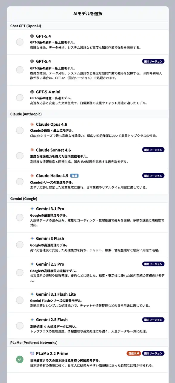OpenAI・Anthropic・Google・Preferred Networksの主要4社から厳選した12モデルを搭載し、用途に応じて最適なAIを選択できる環境を提供しています。 |
