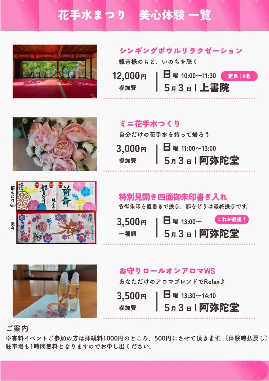 ◎拝観料:拝観料1,000円。(但し、有料イベント参加者は拝観料500円を対象ワークショップより払い戻しの上、駐車場1時間無料) |