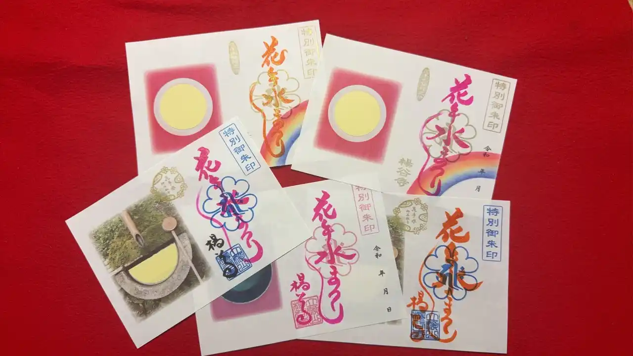 楊谷寺を代表する御朱印として、通年大人気の「押し花朱印つくり」(写真3,4枚目の両面のもの)では、一緒に授与される押し花シールを参拝者自身が好みであしらうという手作りの楽しみが味わえるものとなっている。 |