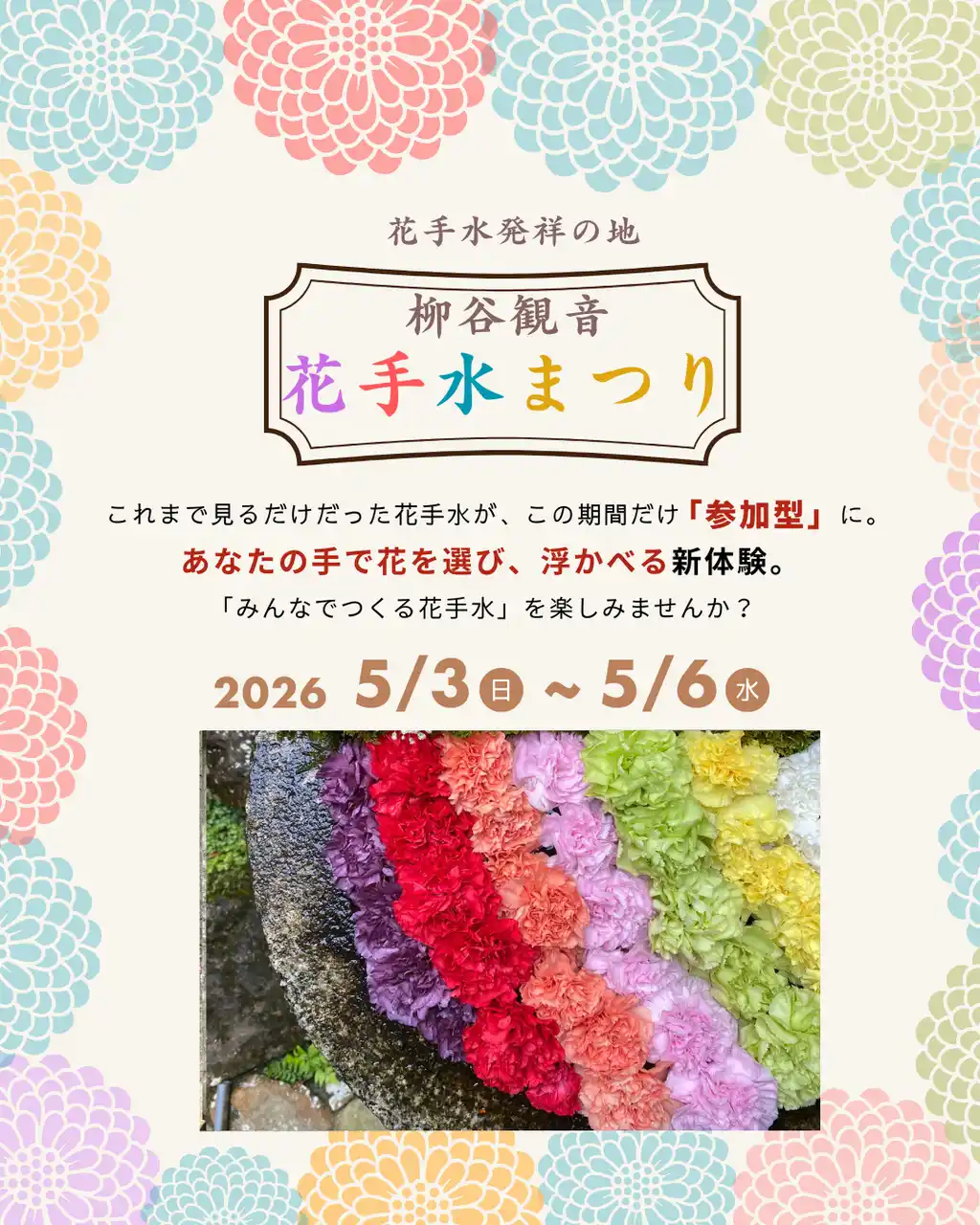 2026年5月3日(日)から5月6日(水)のGW期間中、自分好みの花を選んで浮かべる体験や、大切なペットを花と共に悼み、水塔婆を流す「花供養」など、伝統と現代の感性が融合した「花手水まつり」が開催されます。