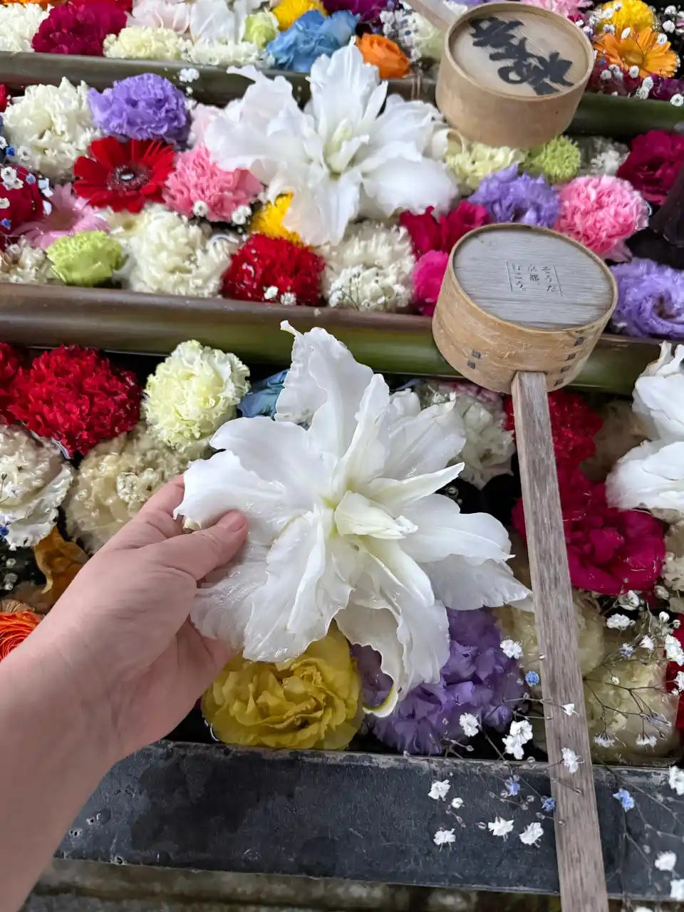通常では、キットの中に同封された季節の花で作ることが出来るが、5月4日の授与では好きなデザインのお手水を選んで好きなお花を好きなだけ飾りつけることが出来る。 |