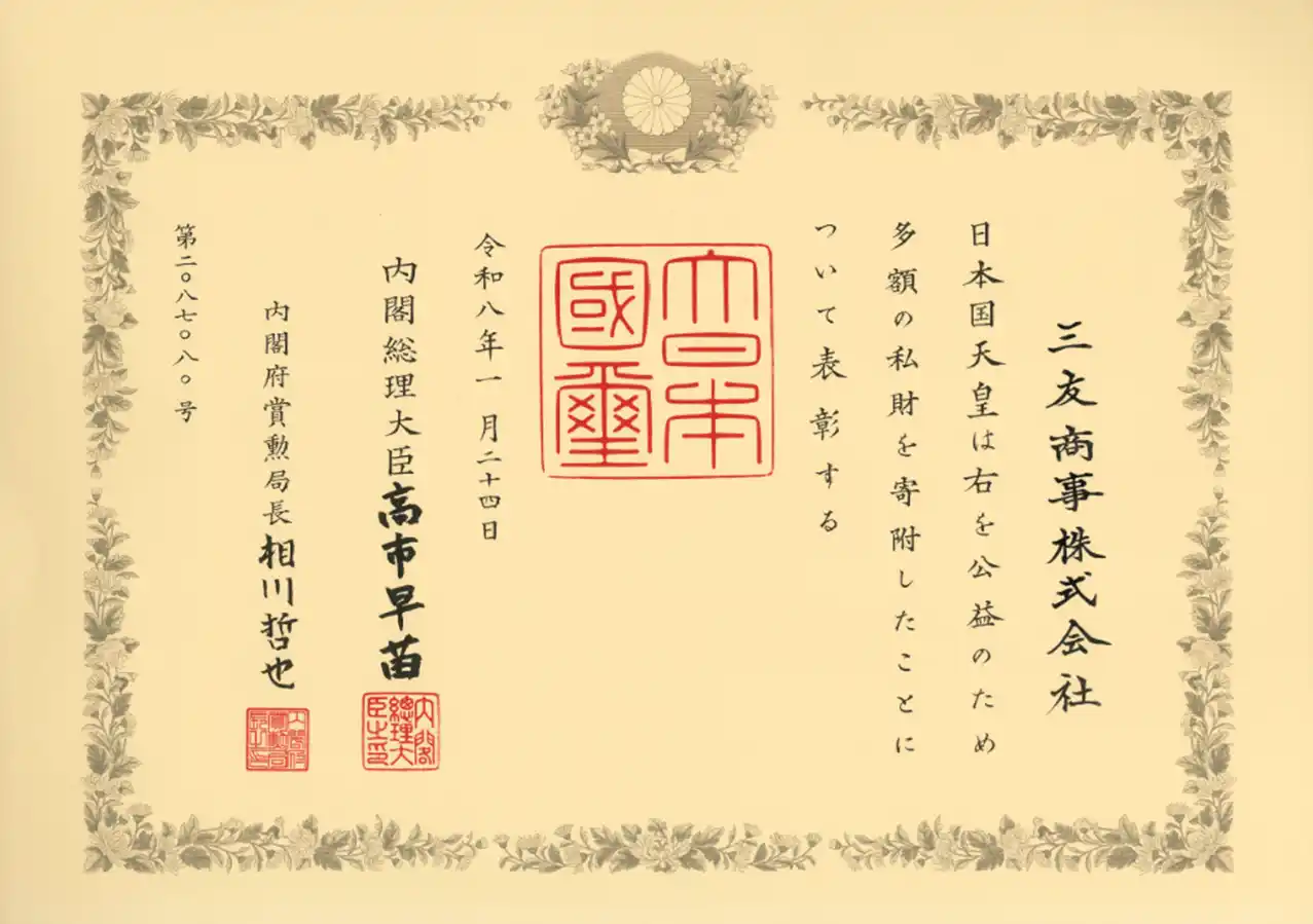 紺綬褒章は、公益のために私財を寄付した個人・法人に授与される栄誉ある褒章です。三友商事株式会社は、災害時や感染対策が求められる現場に対し、オゾン除菌脱臭機「エアバスター」を寄贈し、継続的な空間衛生環境の維持に寄与してまいりました。今回の受章は、こうした「実際の現場で活用される支援」が社会的に評価されたものです。 |