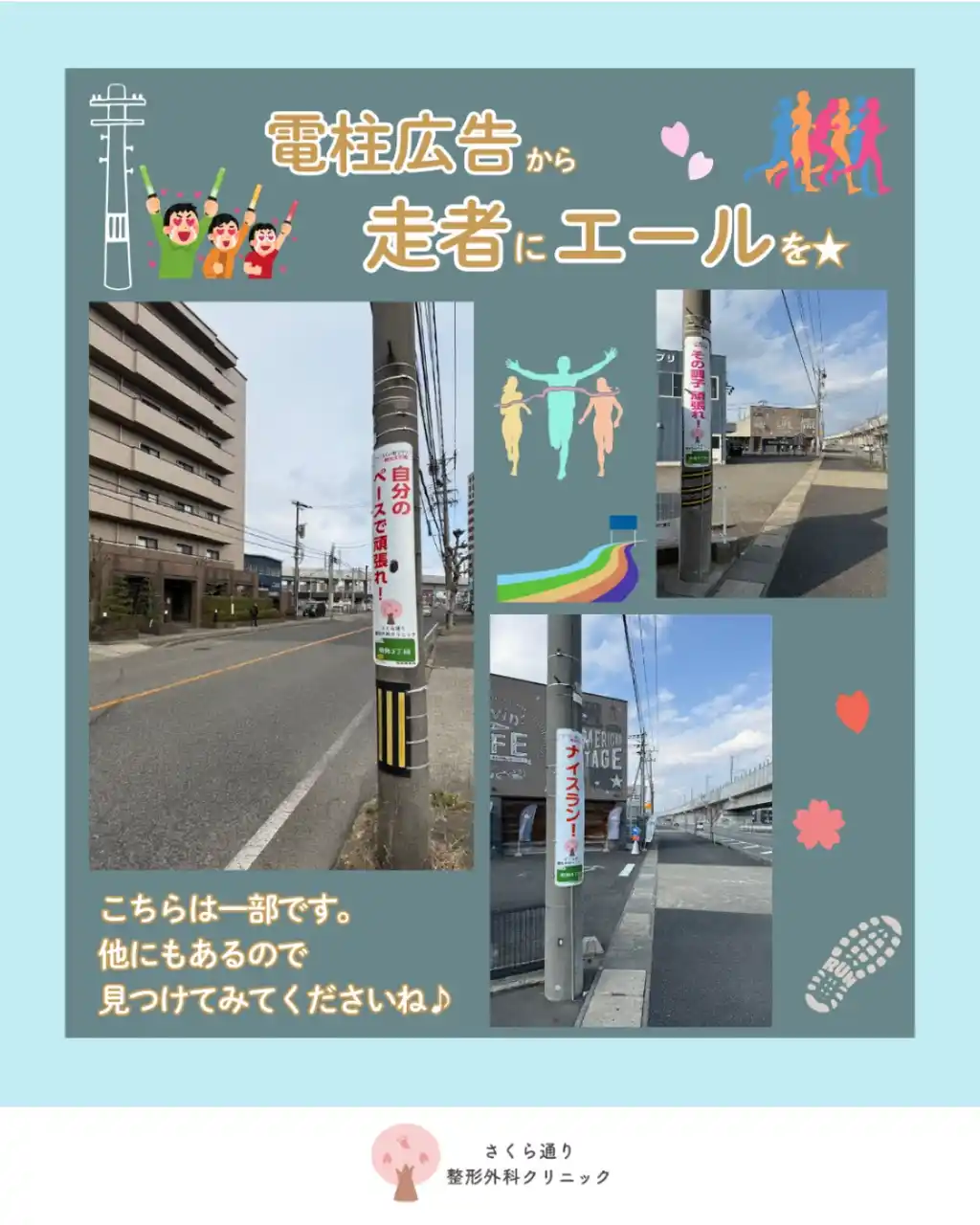 2026年3月29日に開催された「福井さくらマラソン」において、さくら通り整形外科クリニックは大会を応援する取り組みとして、電柱広告180本を展開し、参加ランナー全員へエールを送りました。 |