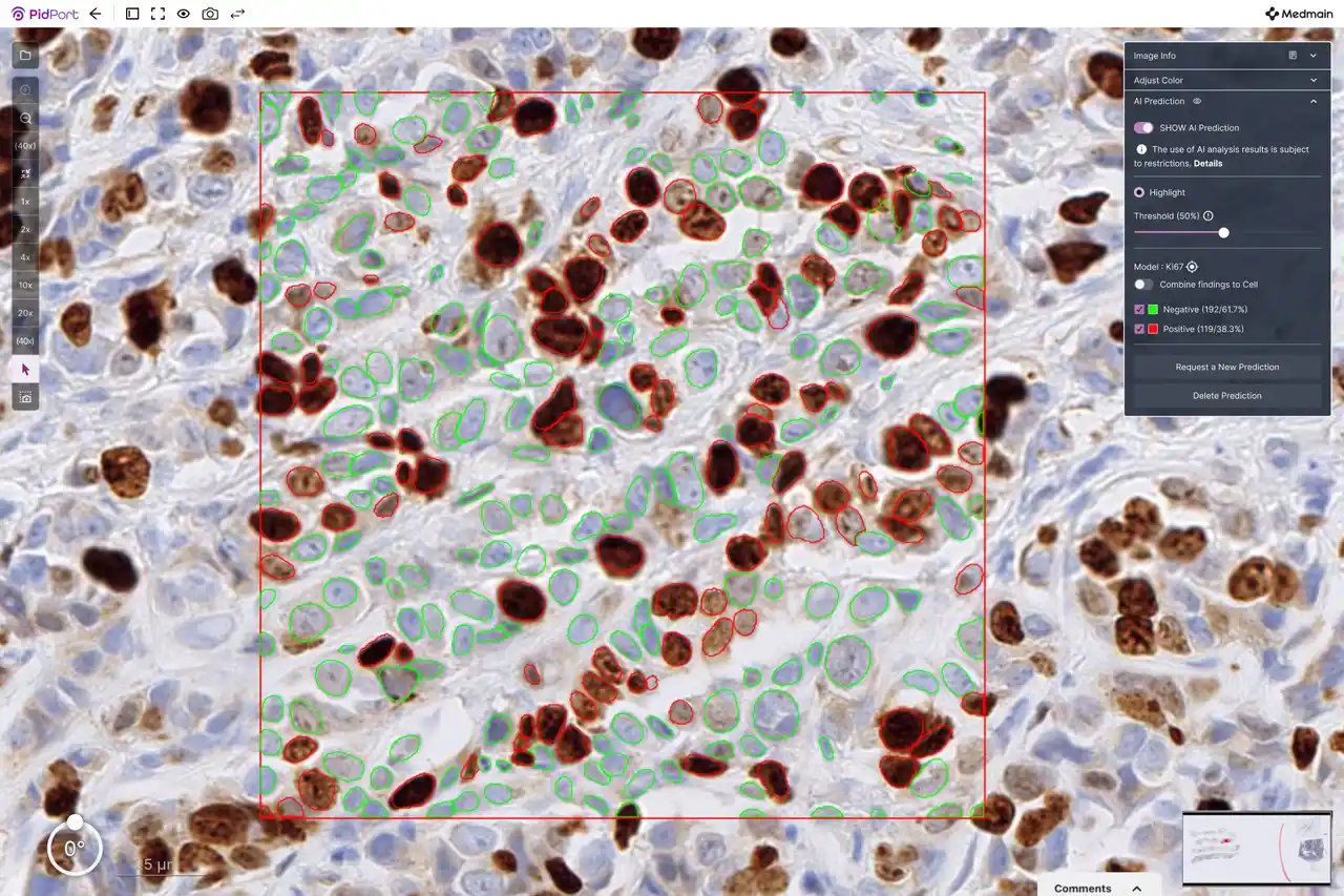 | デジタル病理支援ソリューション「PidPort」を提供するメドメイン株式会社(本社:福岡県福岡市、代表取締役CEO:飯塚 統、以下「メドメイン」)は、Ki-67タンパク質の免疫組織化学デジタル標本において、Ki-67陽性細胞を検出し、陽性細胞率(Labeling Index)を自動計測するAIの開発に成功いたしました。 | |||