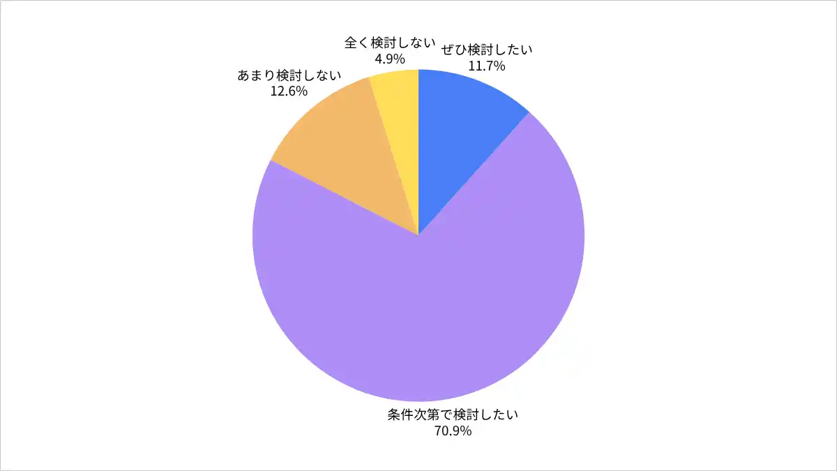 ぜひ検討したい(23.3%) / 条件次第で検討したい(59.2%) / あまり検討しない(14.6%) / 全く検討しない(2.9%) |