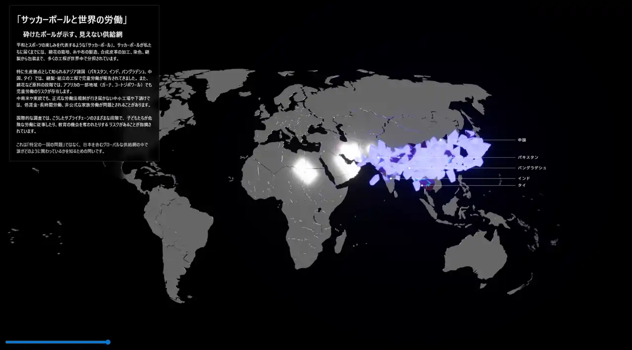 平和とスポーツの楽しみを象徴する「サッカーボール」。しかし私たちの手元に届くまでには、綿花の栽培から縫製・包装まで、無数の工程が世界中で分担されています。パキスタン・インド・バングラデシュ・中国・タイなどでは縫製工程での児童労働が、ガーナ・コートジボワールなどでは原料段階でのリスクが報告されています。本作品はこうした実態を、日本を含むグローバルな供給網の問題として問いかけます。 |