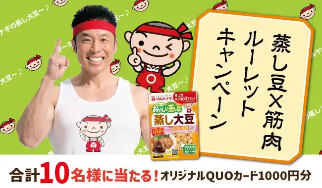 蒸し豆・佃煮・煮豆メーカーの株式会社マルヤナギ小倉屋(神戸市東灘区 代表取締役社長:柳本勇治)は4月3日(金)より、「おいしい蒸し豆」シリーズ3億食突破を記念して、マルヤナギ公式Instagram・Xにて、「蒸し豆×筋肉ルーレットSNSキャンペーン」を実施いたします。このキャンペーンは、マルヤナギ公式SNSをフォローのうえ、キャンぺーン用ショート動画を視聴してスクリーンショットをとり、該当ハッシュタグを付けて投稿いただくことで応募可能です。抽選で、なかやまきんに君オリジナルQUOカード1000円分をXで5名、Instagramで5名の合計10名様にプレゼントします。 |