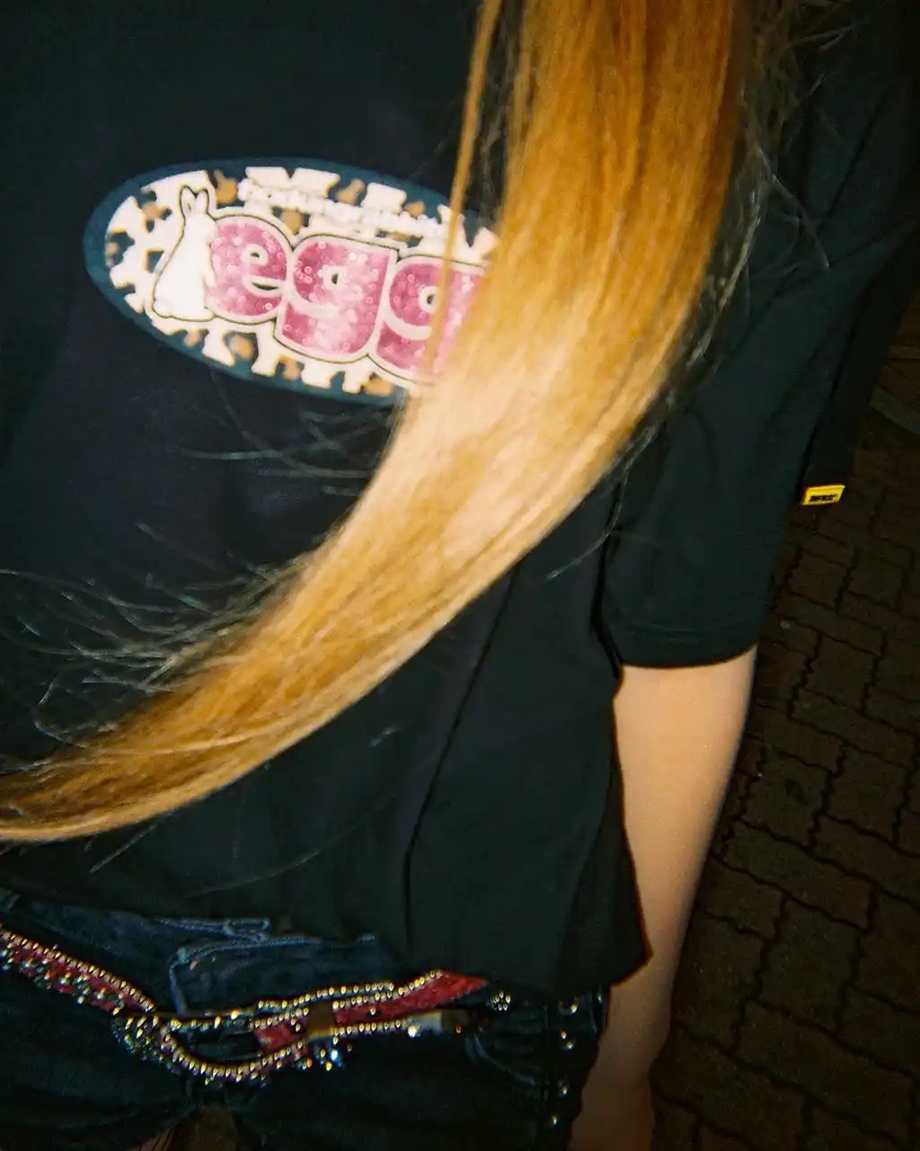 「egg × #FR2 Gal T-shirt」は、フロントに『egg』と#FR2のオリジナルロゴを、バックにギャルカルチャーをモチーフにしたイラストをプリント。ルーズソックスやPHS、ハイビスカスなど、1990年代後半の女子高生像を想起させるグラフィックに加え、『egg』ロゴにはラメ感のあるプリントを採用しています。 |