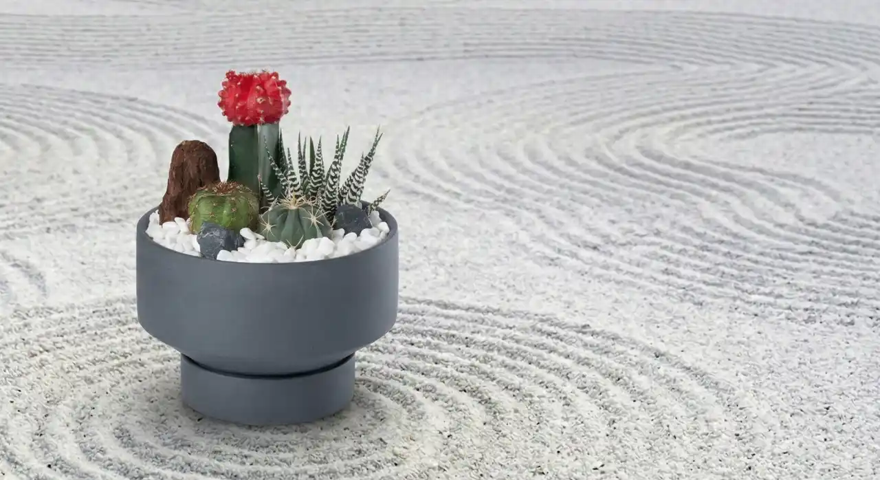 RYOHAKU - りょはく - の「和モダン」では、そんなサボテンの個性を活かしながら、石や白砂を思わせる素材、余白を意識した寄せ植え、空間になじむ落ち着いた鉢のデザインを組み合わせることで、“和モダン”の世界観を表現しました。 |