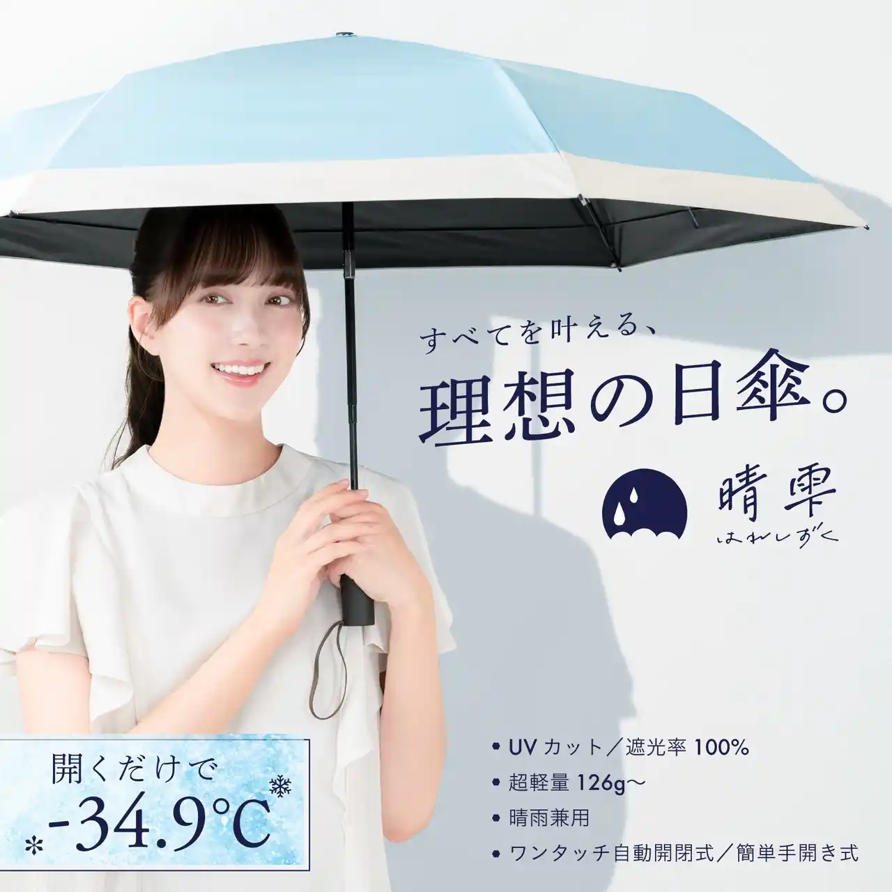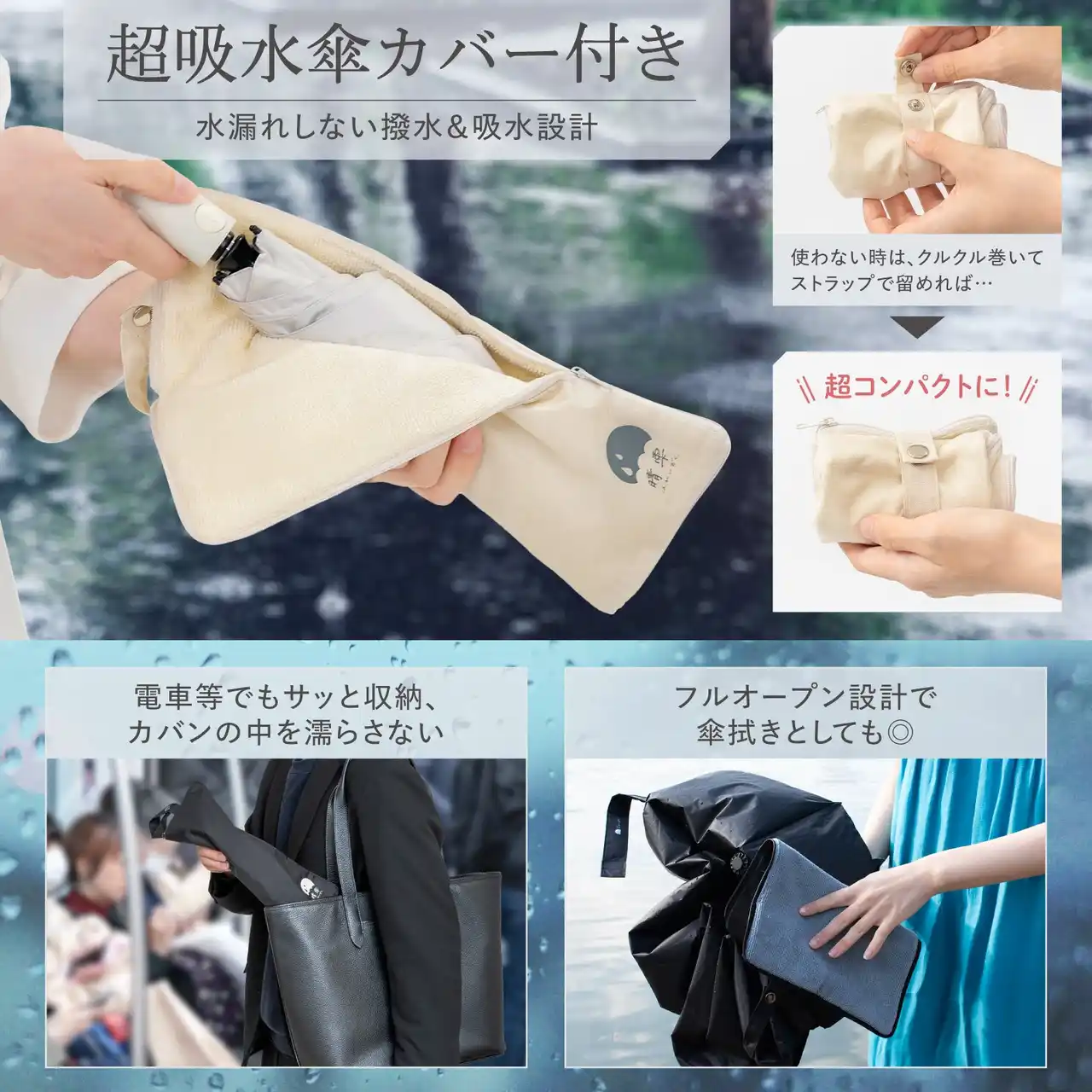 日傘と雨傘を持ち替えない“1本で完結”という発想のもと、完全遮光・UVカット100%・126g~の軽量設計に加え、濡れた傘をそのまま収納できる吸水カバーを採用。移動中はカバンを濡らさず、帰宅後はカバーをタオルのように使って水滴を拭き取り、そのまま乾燥させることが可能です。 |