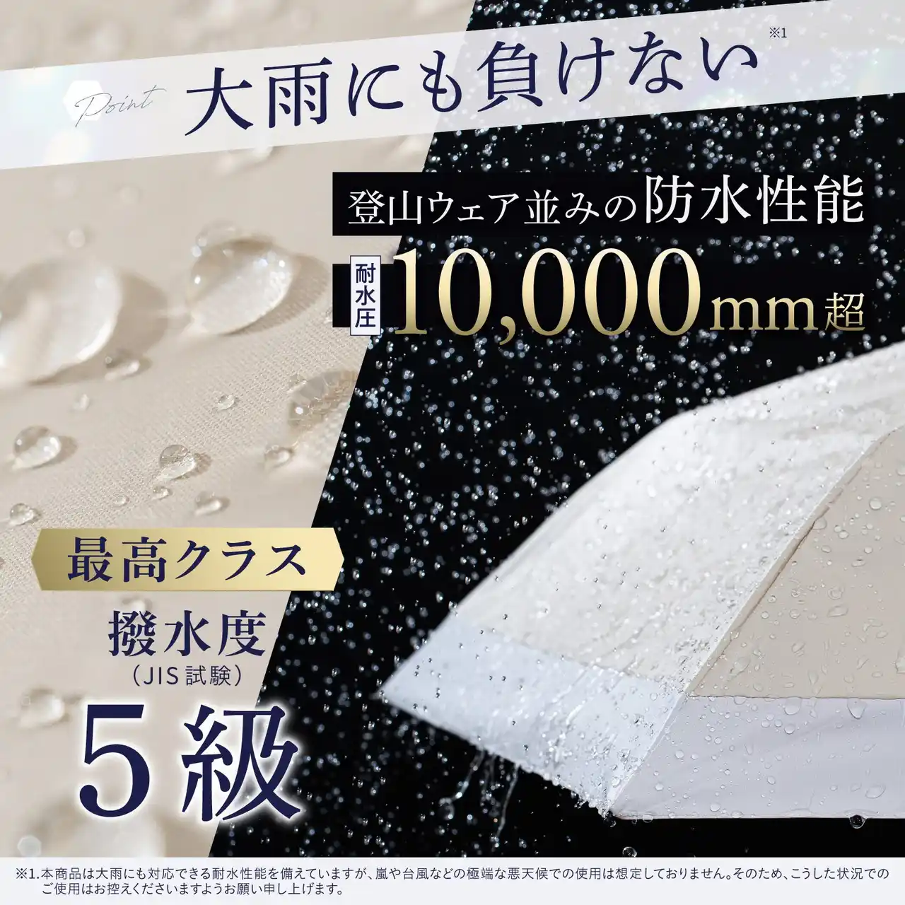 濡れた後の扱いに困らない吸水カバー、軽さと遮光性を両立した基本性能。 そのすべてが、「1本で完結する使いやすさ」につながっています。 |