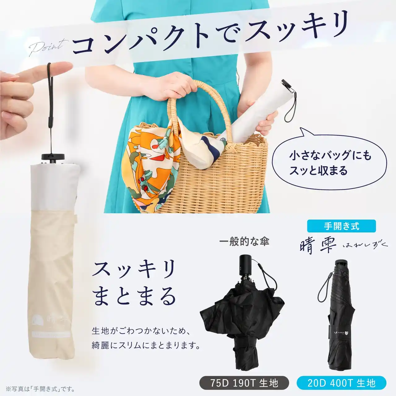 晴雫は、日差しを防ぐだけの「日傘」ではありません。 持ち運び、使用中、そして使った後までを含めて、日常のストレスを減らすために設計された一本です。 |