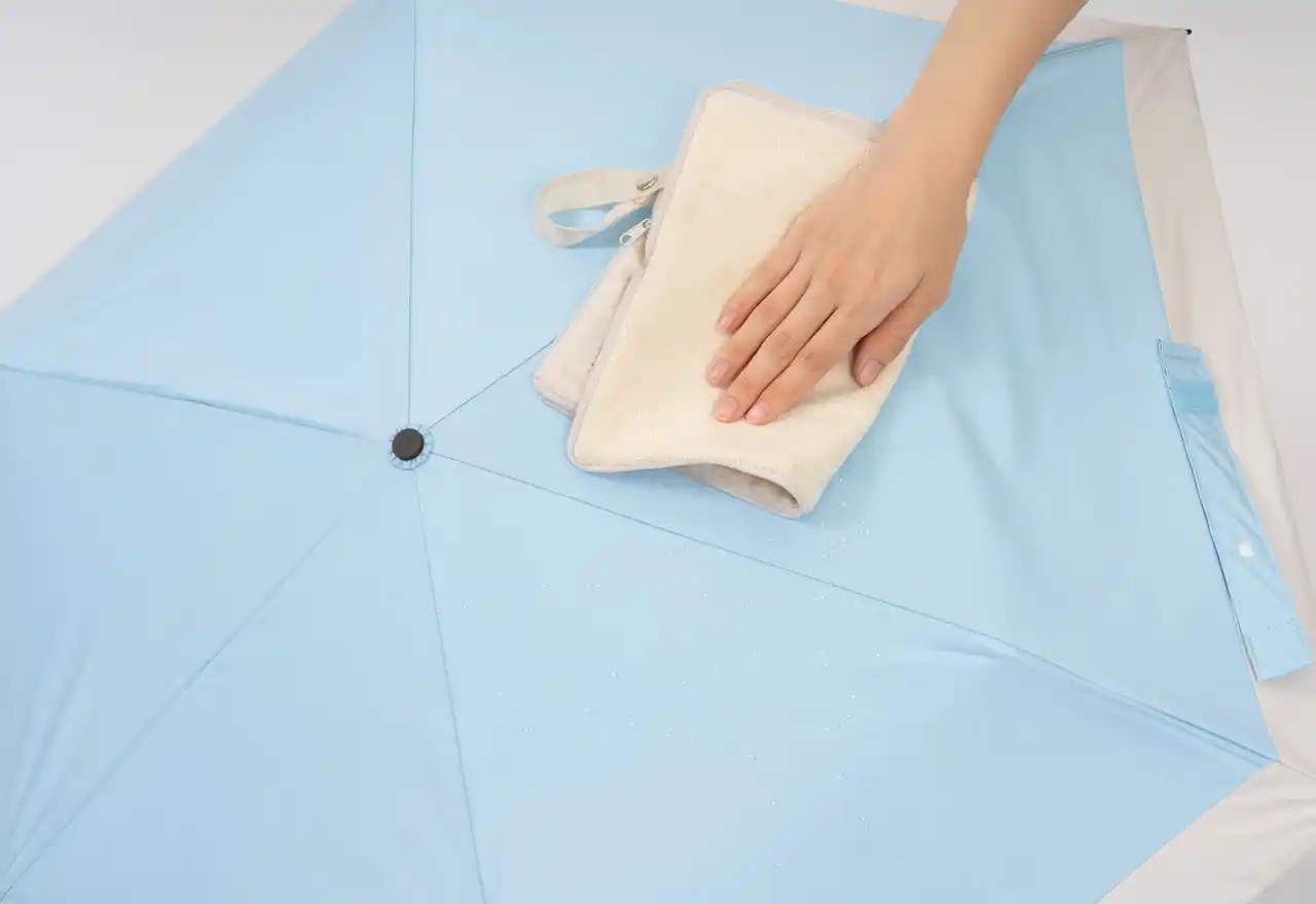 傘の水分を拭き取ることで、しっかり乾燥します。 |