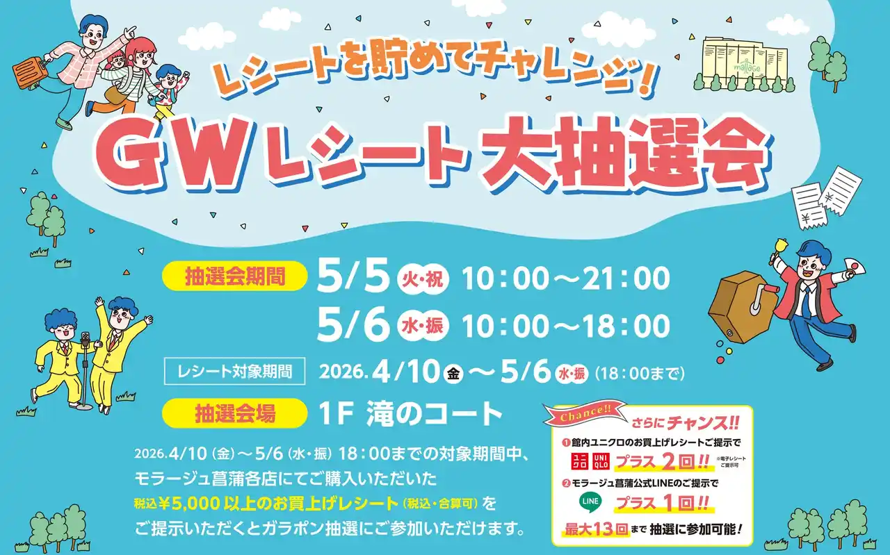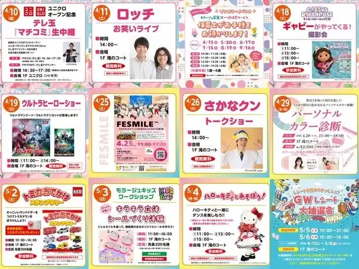 モラージュ菖蒲では、ゴールデンウィーク期間中、多彩なイベントとともに、皆様のご来店を心よりお待ちしております。ぜひお楽しみください! |