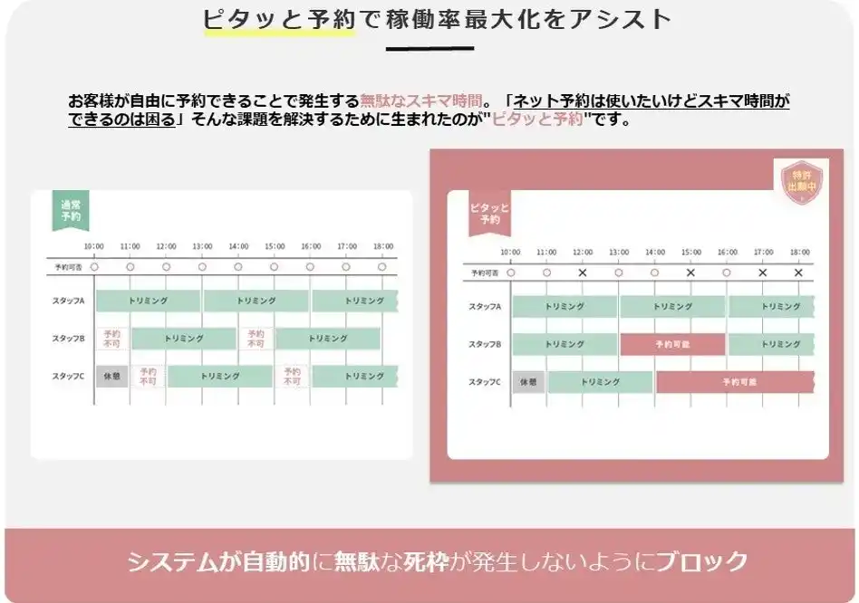 | 「ピタッと予約」は、AIが予約状況・施術時間・スタッフシフト・犬個体をリアルタイムで解析し、 | ||||