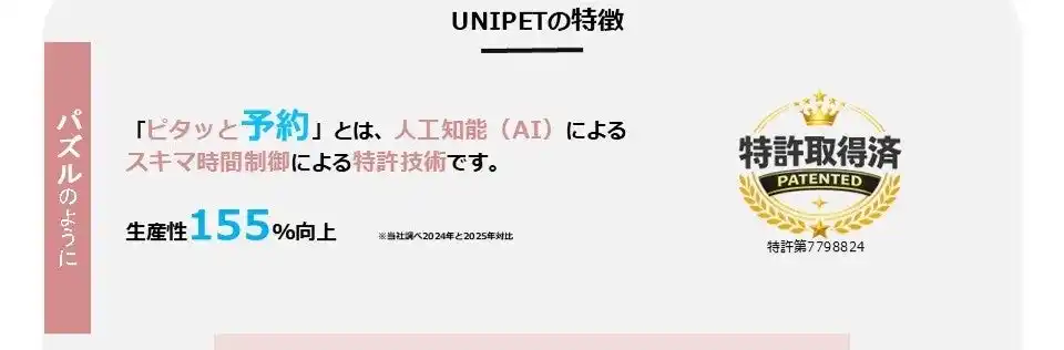 トリミングサロン向け予約管理システムUNIPET株式会社(東京都品川区、代表取締役 小宮進)は、 AIで予約の“スキマ時間”を自動調整する新機能「ピタッと予約」をリリースしました。 |
