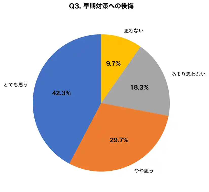| 色素沈着を経験した人のうち、「とても思う」「やや思う」を合わせると72.0%が早期の紫外線対策を後悔していることが判明しました。色素沈着は予防が重要であり、できてしまってから改善するには時間と費用がかかることを示唆しています。 | ||||||||||||||||||||||||||||