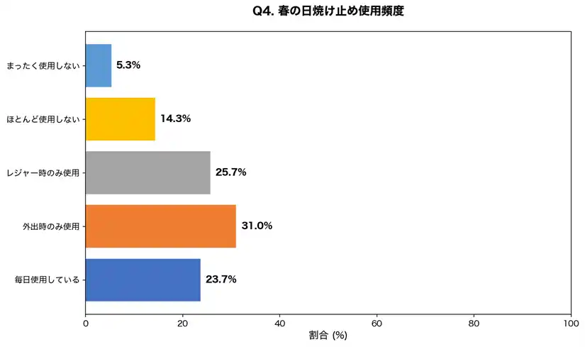 | 春に日焼け止めを「毎日使用している」人はわずか23.7%にとどまりました。一方で「ほとんど使用しない」「まったく使用しない」を合わせると19.6%となり、約5人に1人が春の紫外線対策をしていない実態が明らかになりました。 | ||||||||||||||||||||||||||||