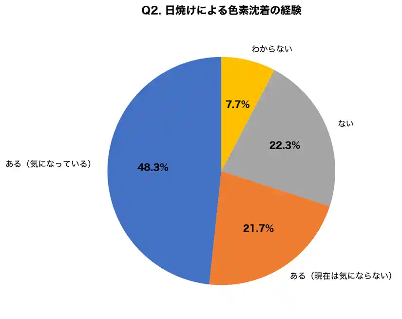 | 日焼けによる色素沈着を経験したことが「ある」と回答した人は合計70.0%に達しました。そのうち48.3%は現在も色素沈着が気になっていると回答しており、一度できた色素沈着が長期間残ることがうかがえます。 | ||||||||||||||||||||||||||||