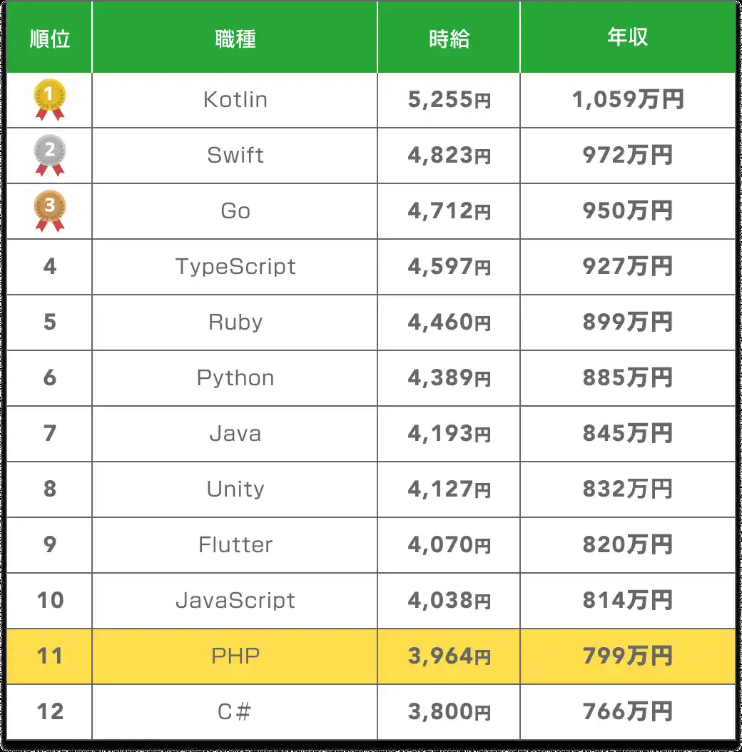 | SOKUDANに掲載されているPHP案件の平均年収は799万円です。職種別年収ランキングでは12位中11位ですが、一般的なエンジニアの年収水準と比較すると高い報酬といえます。 | |||||