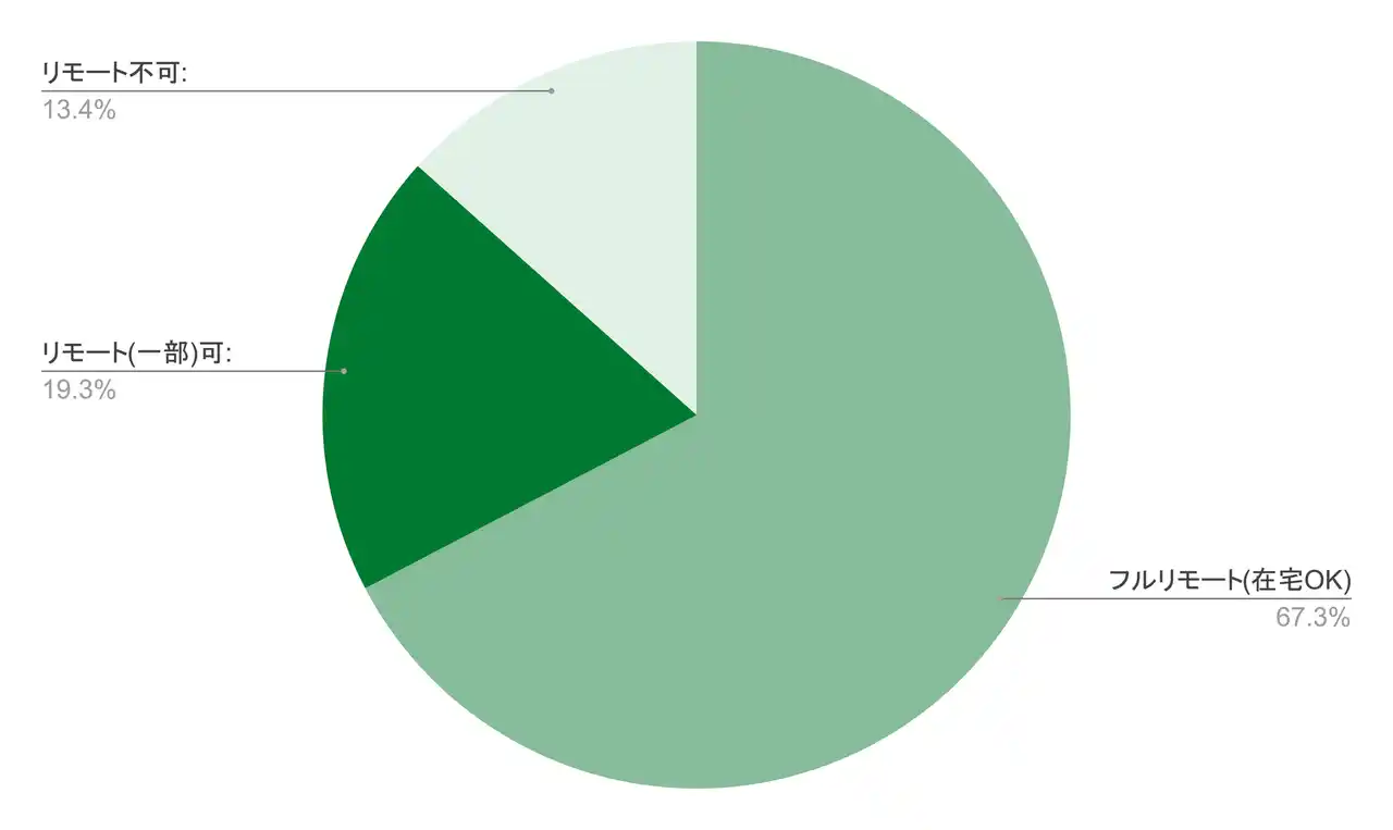 | フルリモートが67.3%と約7割を占め、一部リモート可を含めると86.6%がリモート対応可能です。 | |||||