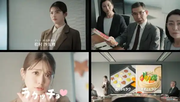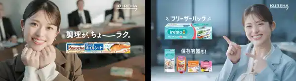 今回のCMでは、新ブランドの商品開発に情熱を注ぐ「クレハ社員」を、私⾃⾝楽しみながら演じさせていただきました。調理が“ちょーラク”になる「Rakucho(ラクッチョ)」と、⾷材から⽇⽤品まであれもこれも⼊れられる 「iremo(イレモ)」 。私自身、毎日バタバタと過ごしているので調理や日常の色々な場面で使える便利なアイテムに助けてもらいながら料理やお片付けを超可愛く楽しくやっていきたいです♡