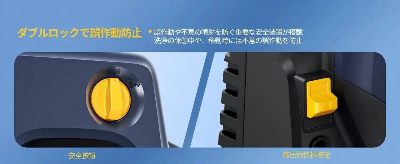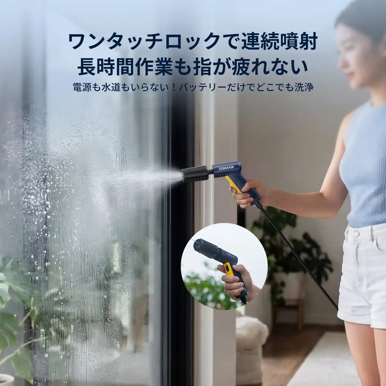連続噴射ロック機能により、レバーを握り続ける必要がなく、長時間でも快適に使用可能。 |