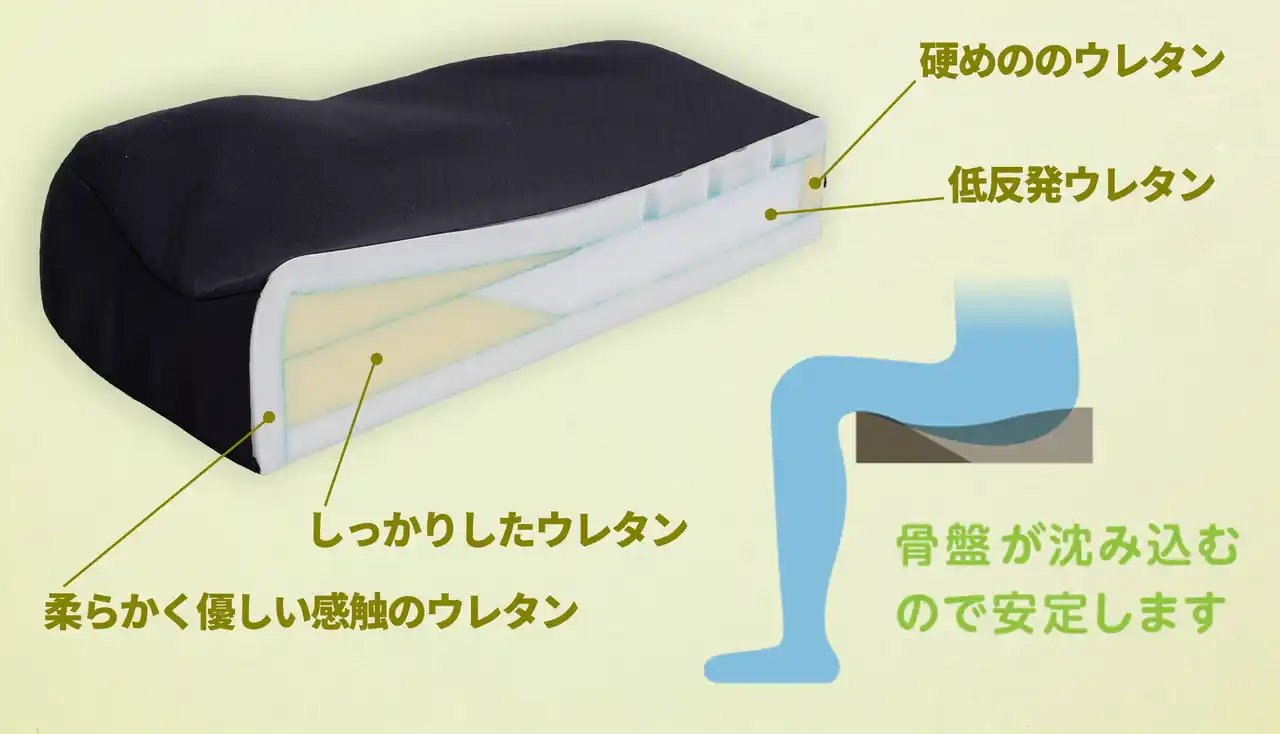 | 硬度・密度の異なるウレタンを尾骨部・大腿部などに配置することにより、体圧分散と姿勢の安定を実現しました。 | |||||||||||||||||||||||||||||||||||||||||||||
