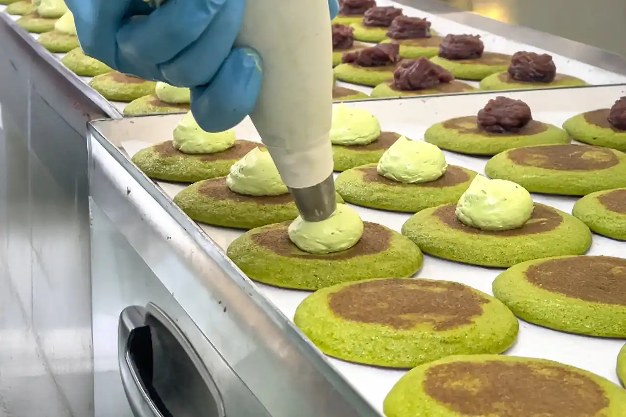 たっぷりの餡を絞ったら、焼き立ての皮でそっと包みます。 |