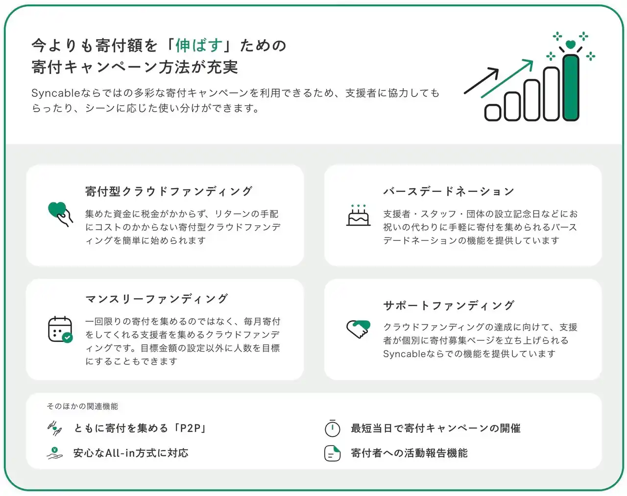 単発の寄付だけでなく、毎月の継続的な支援を集める「マンスリーファンディング」や、支援者自身が寄付を呼びかける「バースデードネーション」「サポートファンディング」など、状況に合わせた多様な手法を提供しています。 |