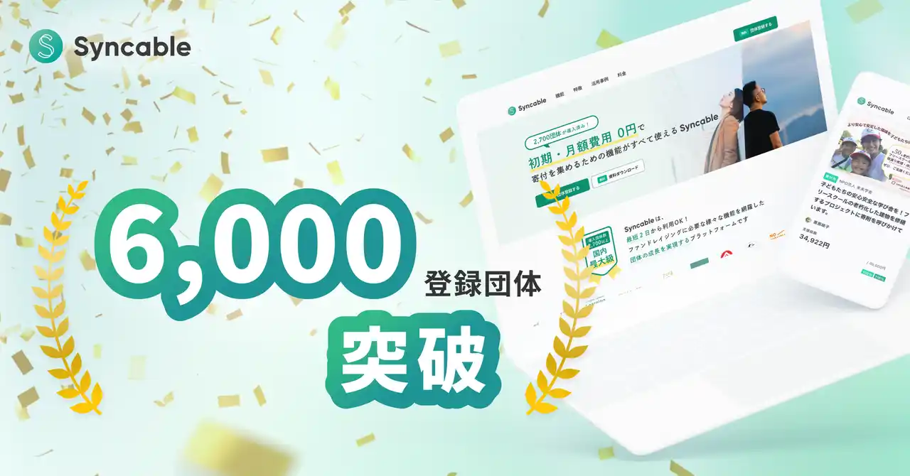 株式会社STYZ(本社:東京都渋谷区、代表取締役 田中辰也)が運営するオンライン寄付プラットフォーム「Syncable(シンカブル)」は、2026年3月10日をもって登録団体数が6,000団体を突破したことをお知らせいたします。2016年3月の会社設立から10年 、当社は一貫して社会課題に取り組む団体に伴走してまいりました。 |