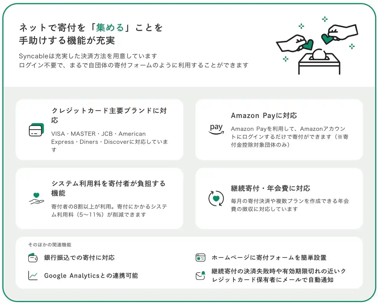 Syncable(シンカブル)」という名称は、「Sync(つながる)」と「able(できる)」を掛け合わせた造語であり、『非営利団体と社会をつなぐ』ことをコンセプトに誕生しました。私たちは、企業や行政が対応しにくい社会課題に柔軟に取り組む非営利団体を支援するためにサービスを提供しており、2016年のリリース以来、国内最大級のデジタルファンドレイジングサービスとして、5,000以上の団体が登録しています。また、多彩な寄付方法を用意することで、支援者各々のご都合やご意向に沿った形で、社会課題解決に貢献できる仕組みを整えています。(https://syncable.biz/) |