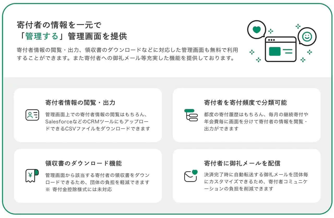 寄付者情報の一元管理、領収書のダウンロード、カスタマイズ可能な自動御礼メールなど、人手不足に悩む団体の事務負担を軽減する機能が標準で備わっています。 |