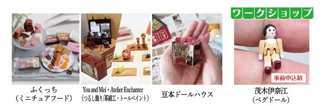 ・豆本ドールハウス 作品販売 ・ふくっち さん(東京・ミニチュアフード)作品販売 ・遊庵 さん(静岡・布小物)作品販売 ・You and Mei さん(宮城・つるし飾り/革細工)/Atelier Enchanter(宮城・トールペイント)作品販売 |